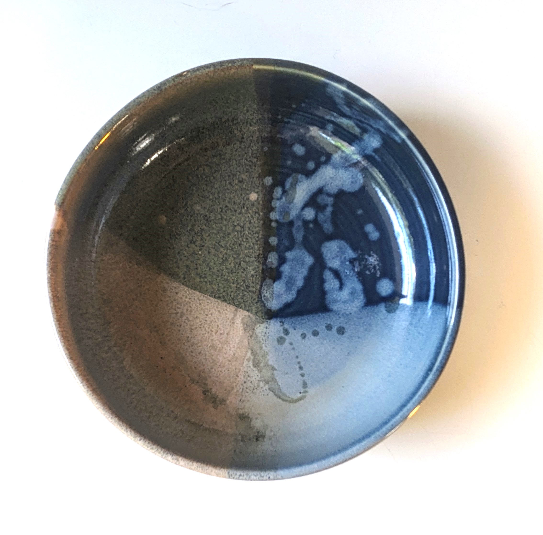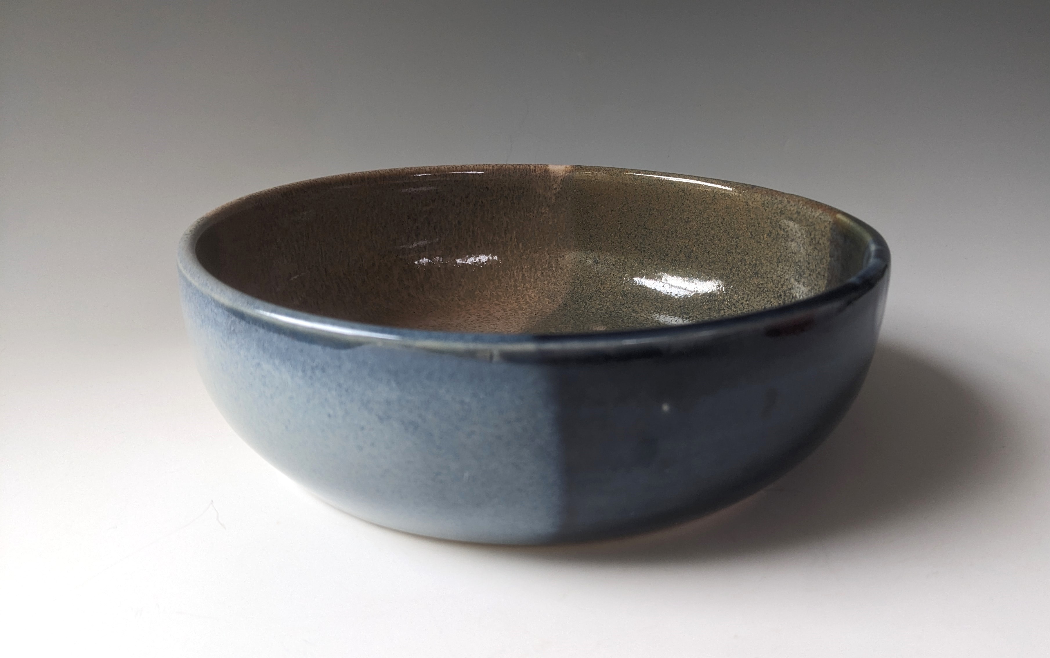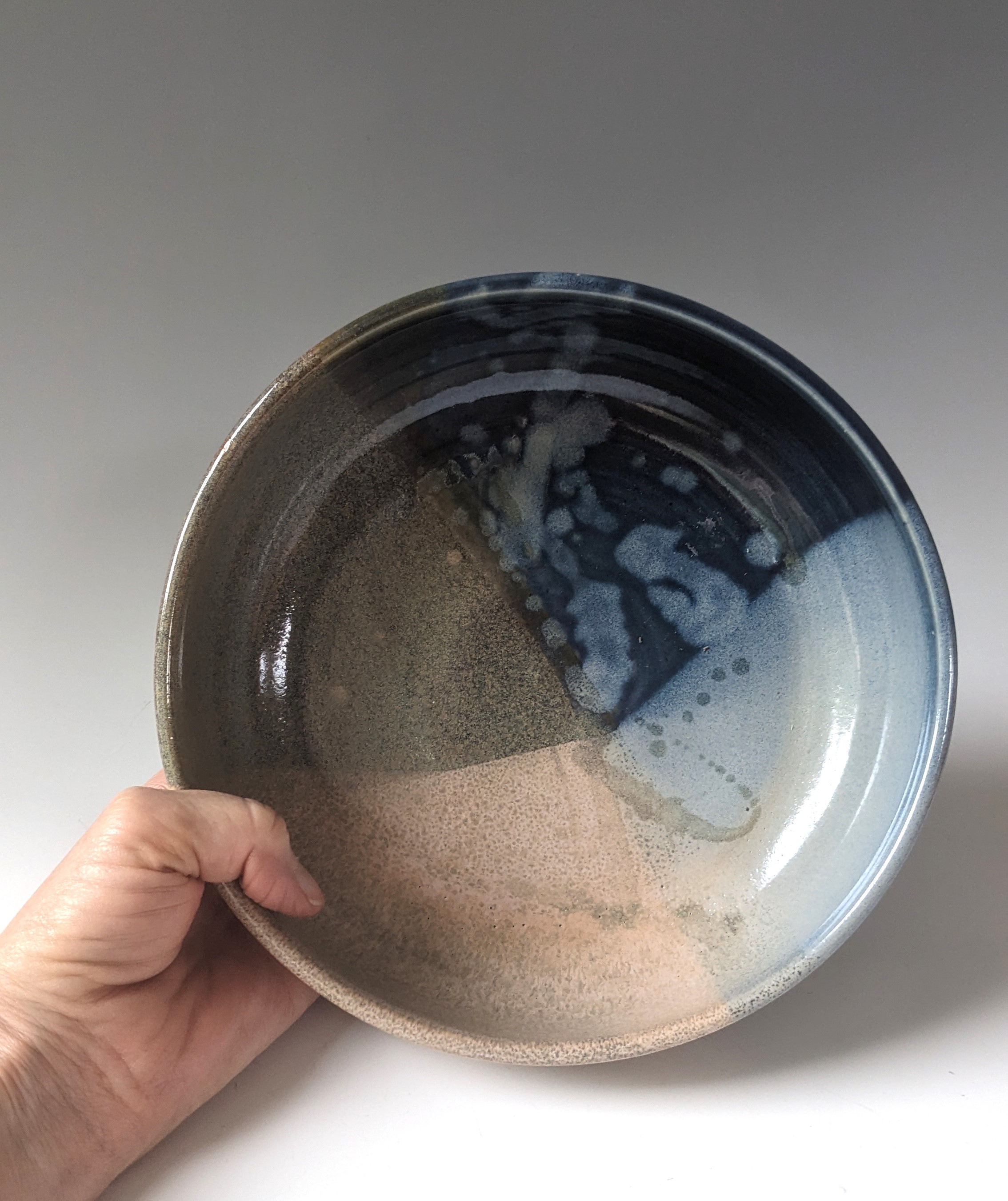 Practical salad bowl in lovely blues and rutile glazes with a soft coffee speckle. Glazed in cobalt, iron and rutile. This is a generous open bowl, ideal for noodles, pasta, salad or rice dishes.