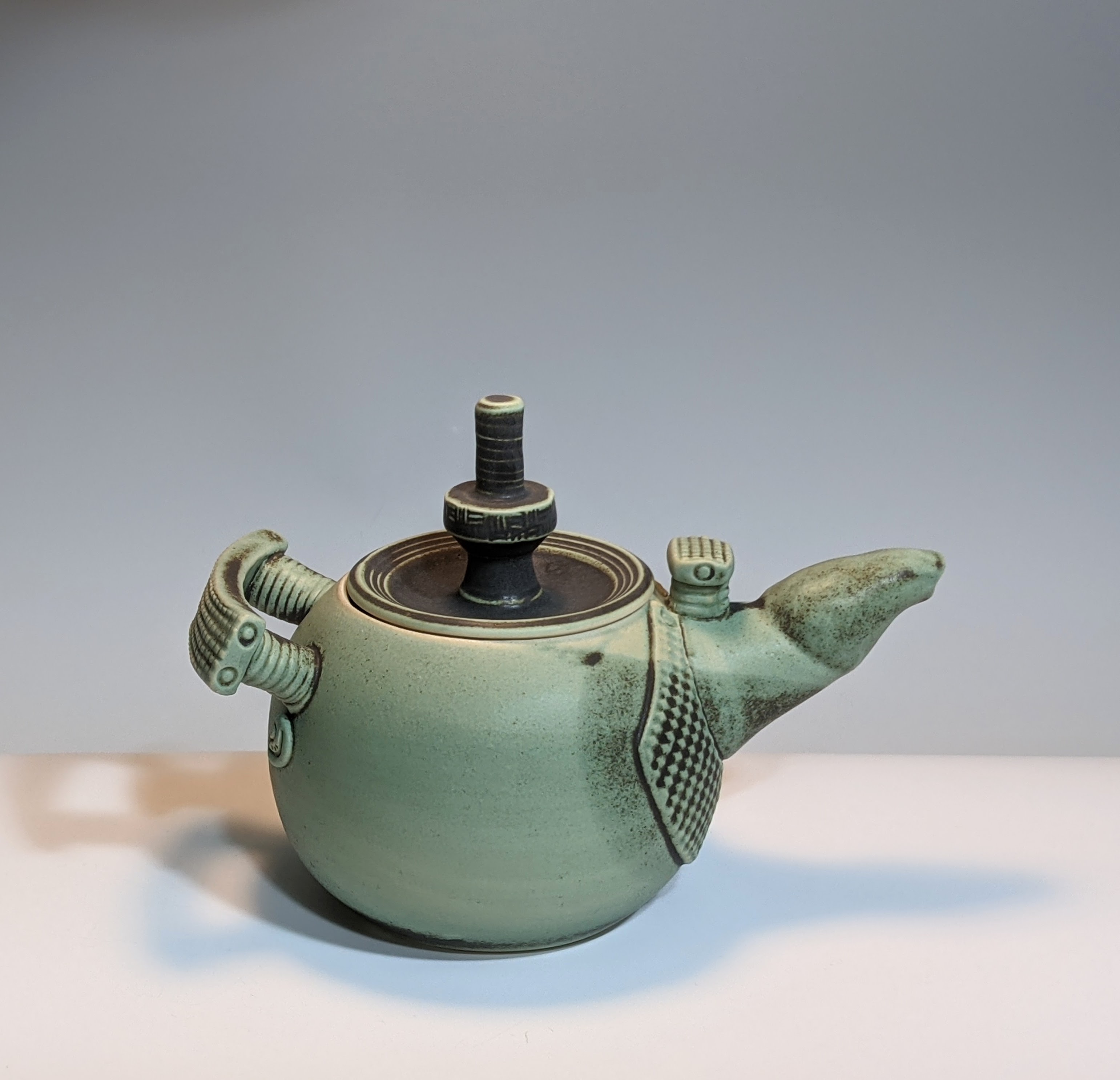 Steampunk inspired teapot. High fired copper matt glaze exterior. Handmade, unique and functional, holds 2-3 cups.