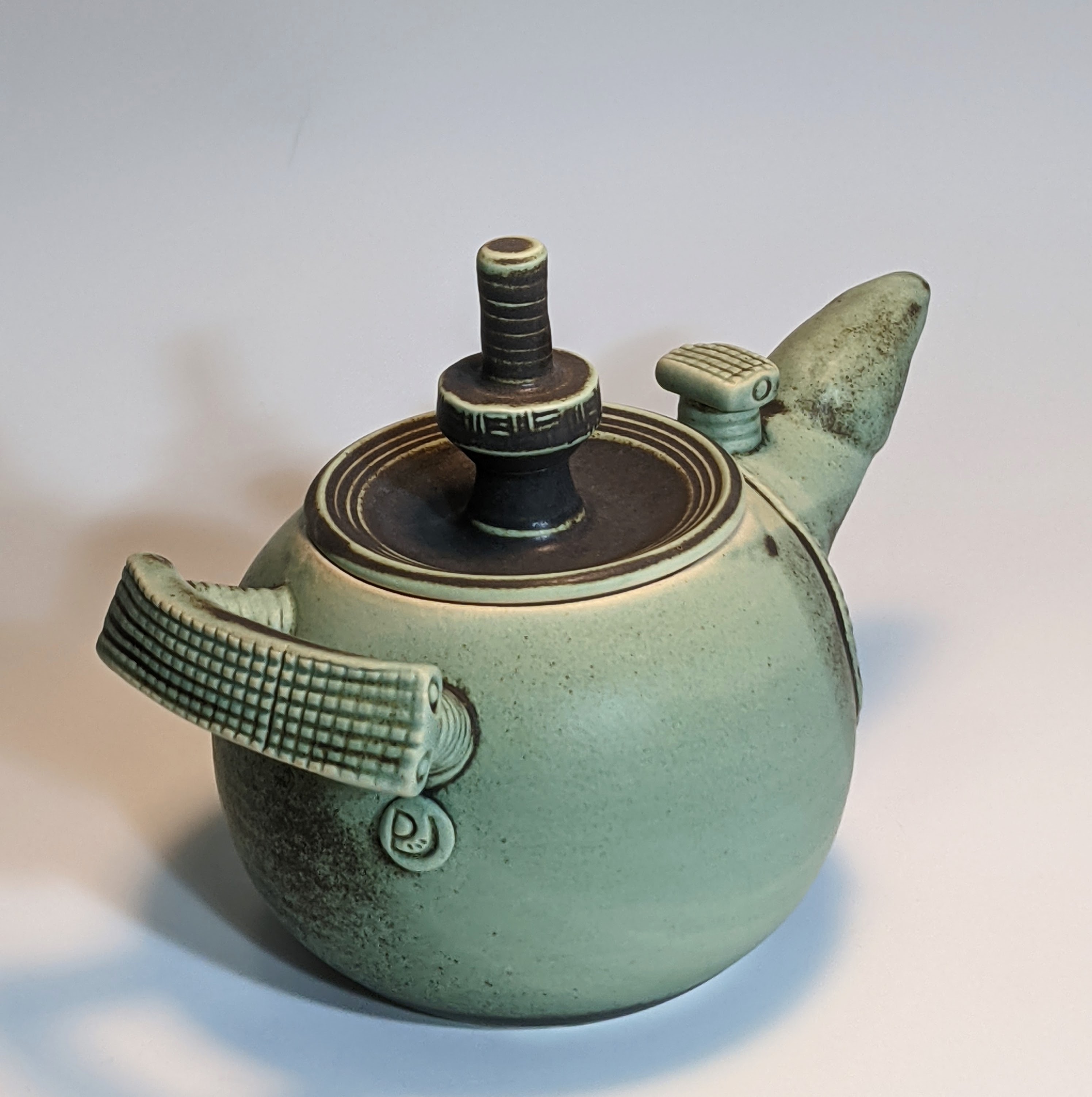 Hand crafted unique Steampunk inspired teapot. Holds 2-3 cups. High fired copper matt glaze exterior and gloss interior.