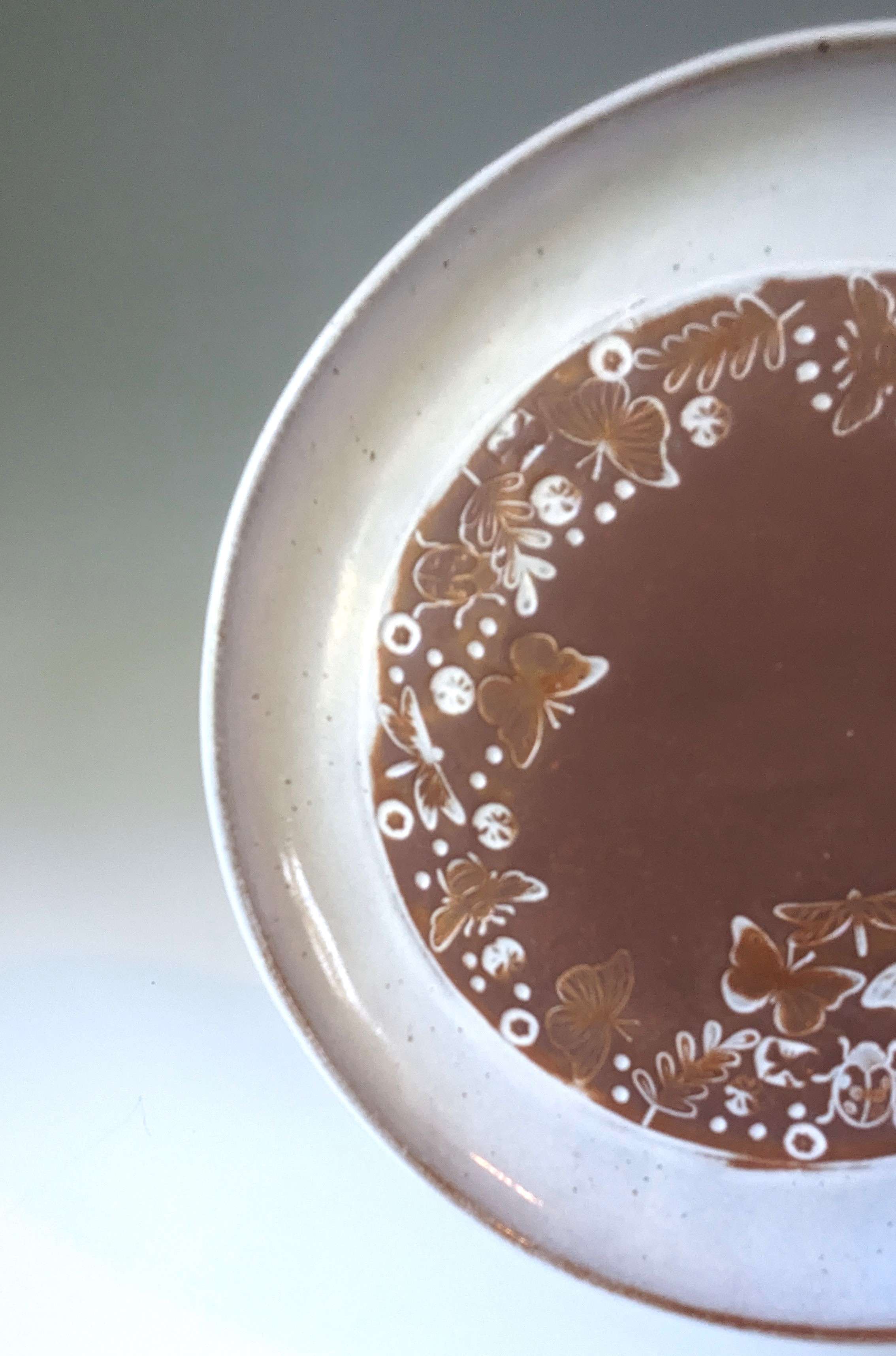 Unusual, useful and delightful! Bugs and botanicals plate with hand decorated botanical features – beetles, bees and butterflies. Gorgeous red mid fired clay with a soft white glaze. Contact us for custom and multiple orders or sets.