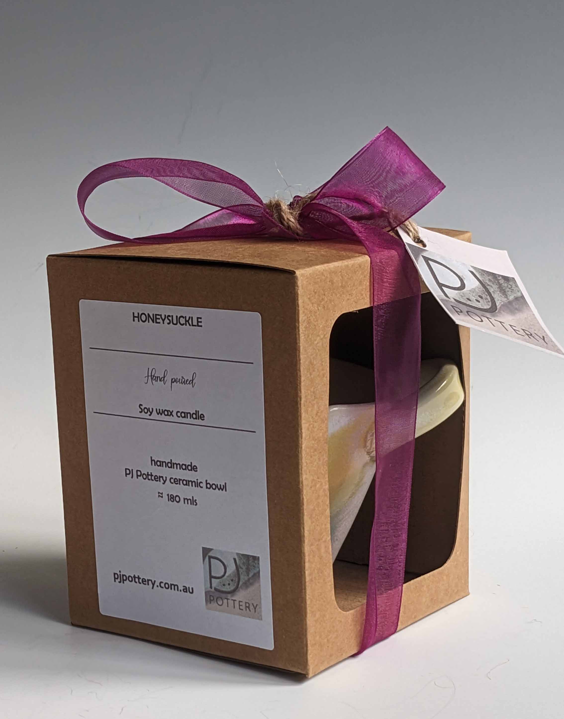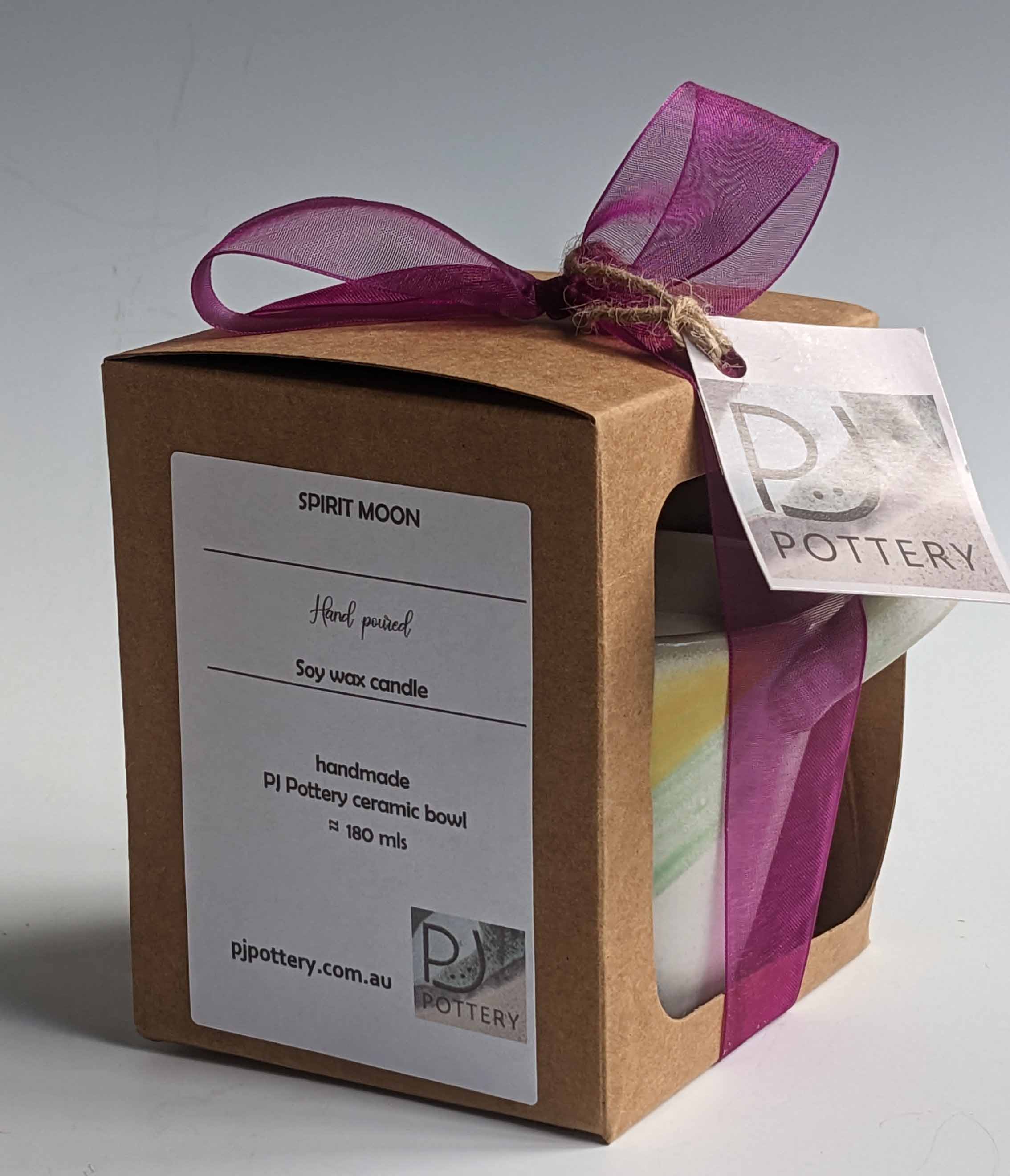 Beautiful PJ Pottery candle bowl in pastels with handles with hand poured 100% soy wax candle | with Spirit Moon fragrant oil | Approximately 150mL | Enjoy creating a soft calm mood and sweet aroma with this lovingly made PJ Pottery piece. Please remember to take care with a lit candle.