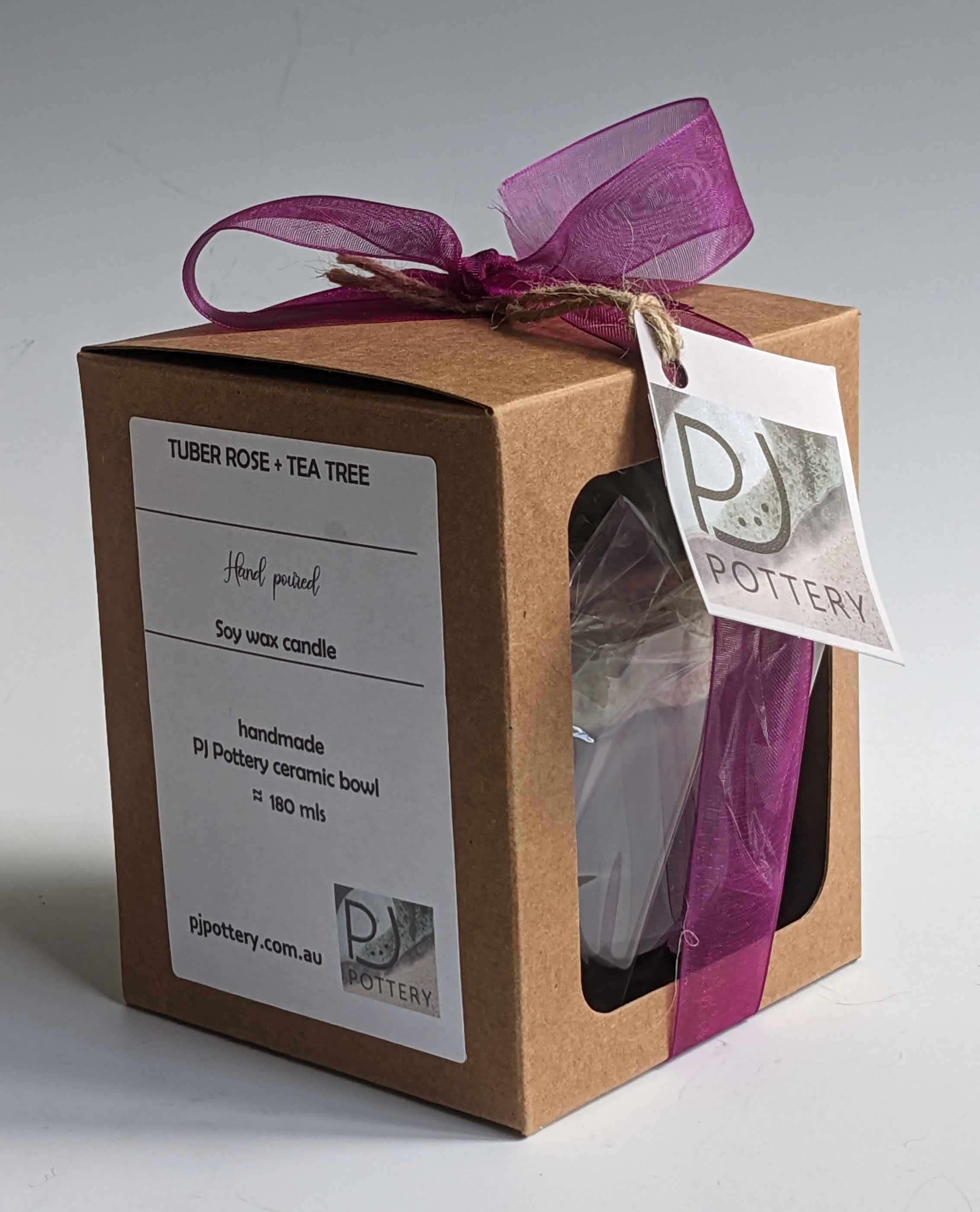 Beautiful PJ Pottery candle bowl in temoku glaze with hand poured 100% soy wax candle | Tuber Rose + Tea Tree fragrance | Approximately 230mL | Enjoy creating a soft calm mood and sweet aroma with this lovingly made PJ Pottery piece. Please remember to take care with a lit candle.