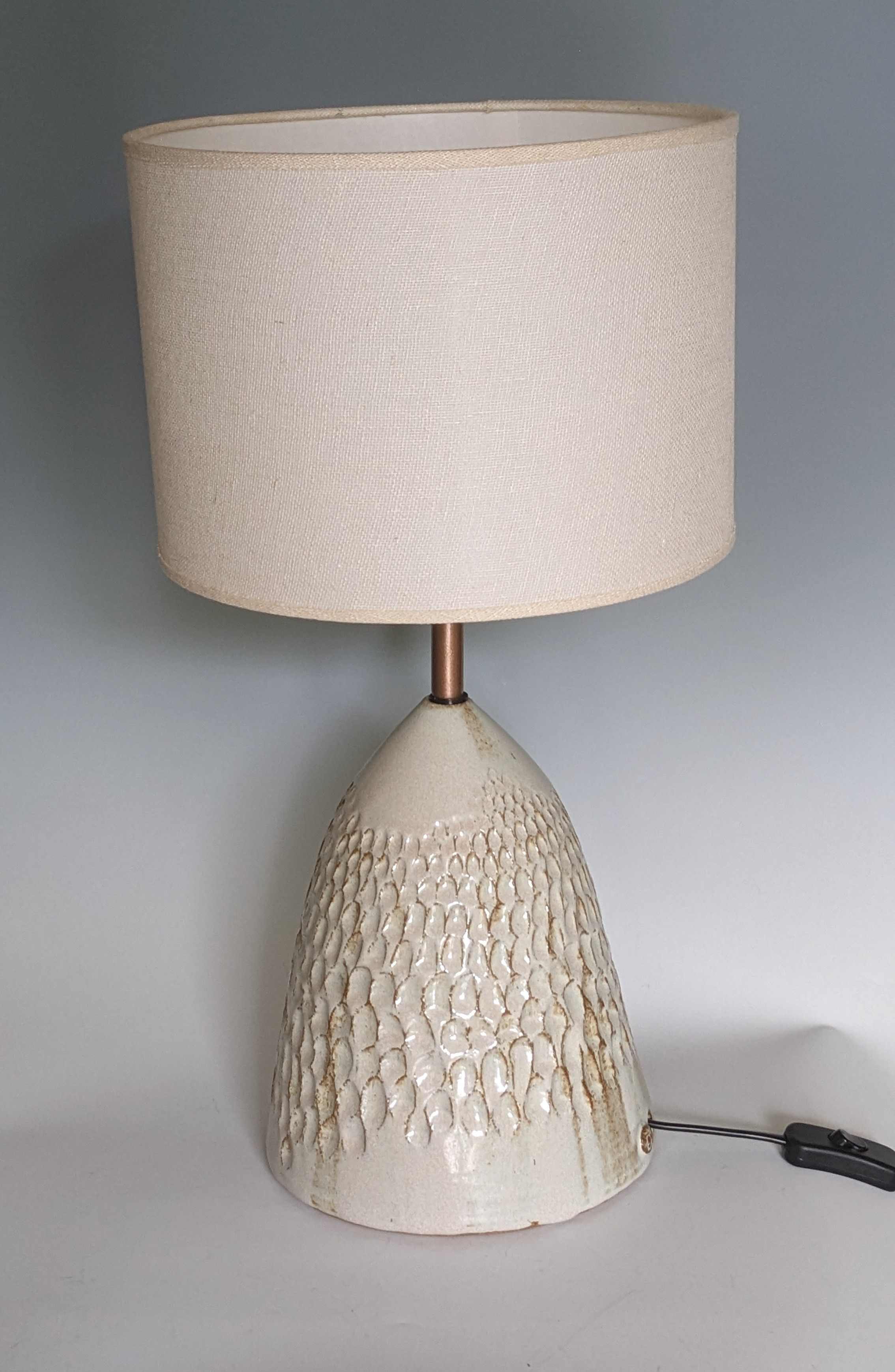 These stylish ceramic table lamps will fit into any home, in timeless neutral tones with unique textural decoration such as faceting, carving and tool impressions. They are high fired hand thrown or hand built ceramic lamp base with linen lampshade included. Base height approximately 29cm, 53cm height with lamp shade.