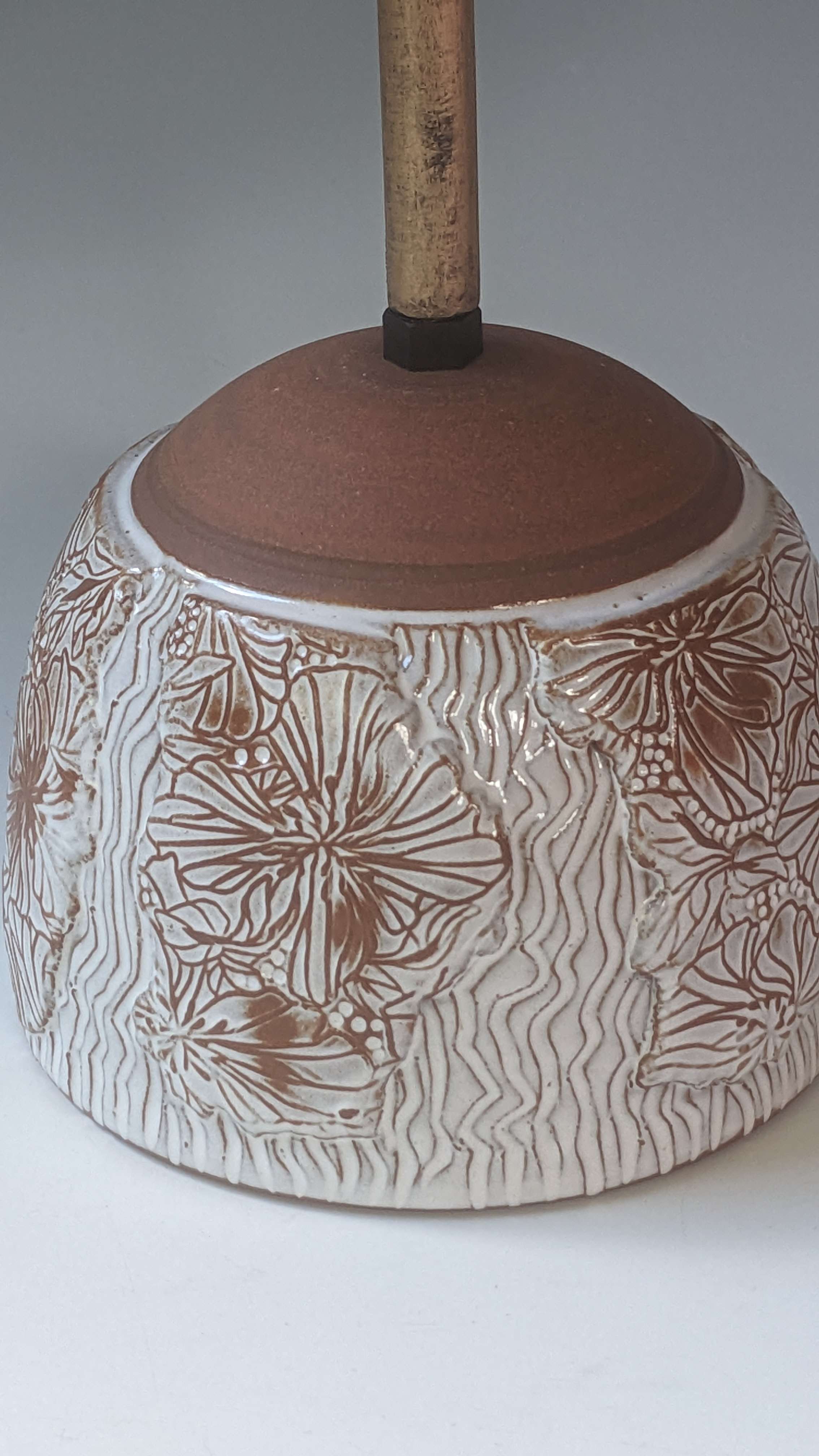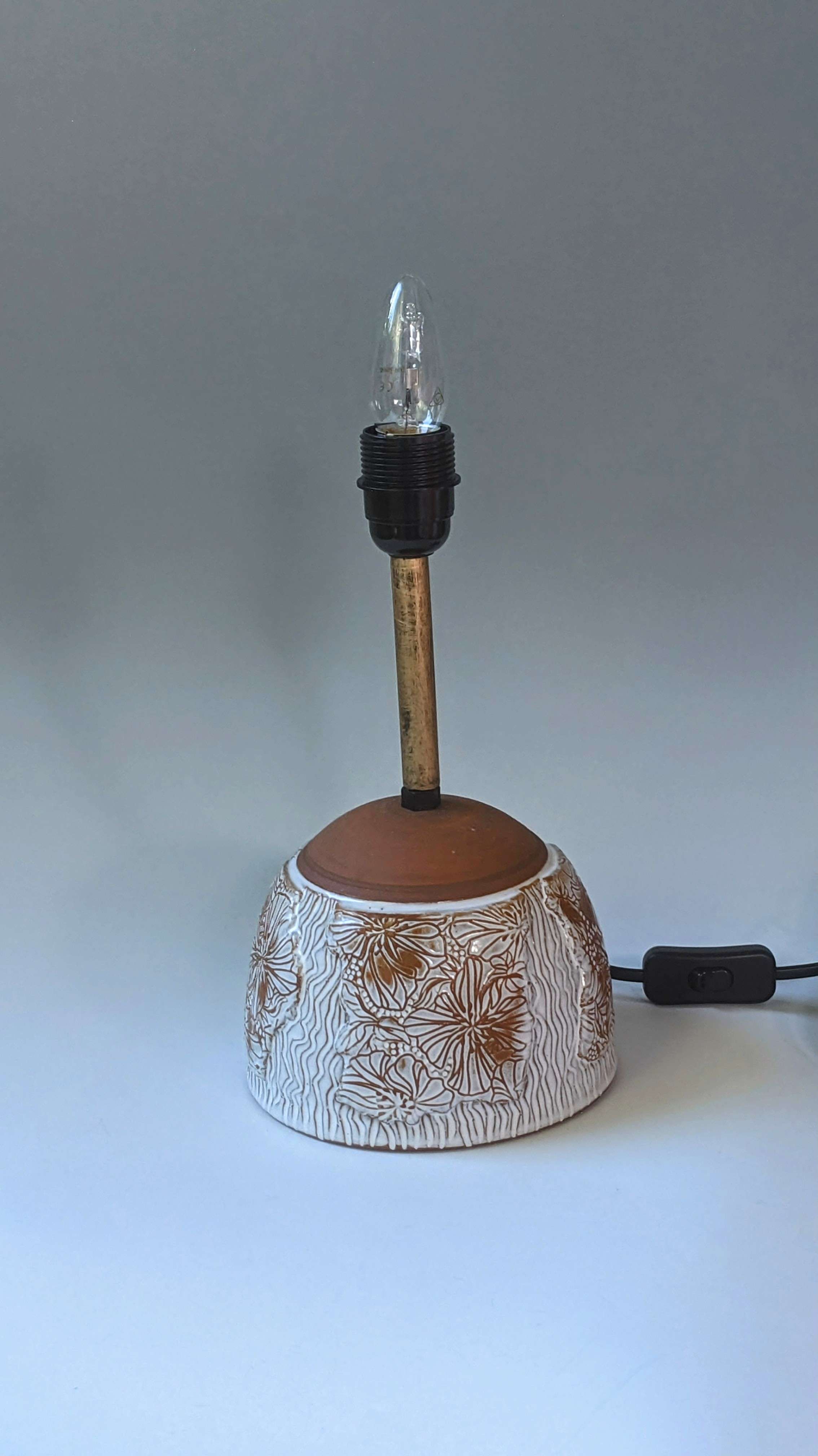 These stylish ceramic table lamps will fit into any home, in timeless neutral tones with unique textural decoration such as faceting, carving and tool impressions. This lamp base is hand thrown in mid fired red clay with a soft white glaze to feature the botanical patterned surface decoration.