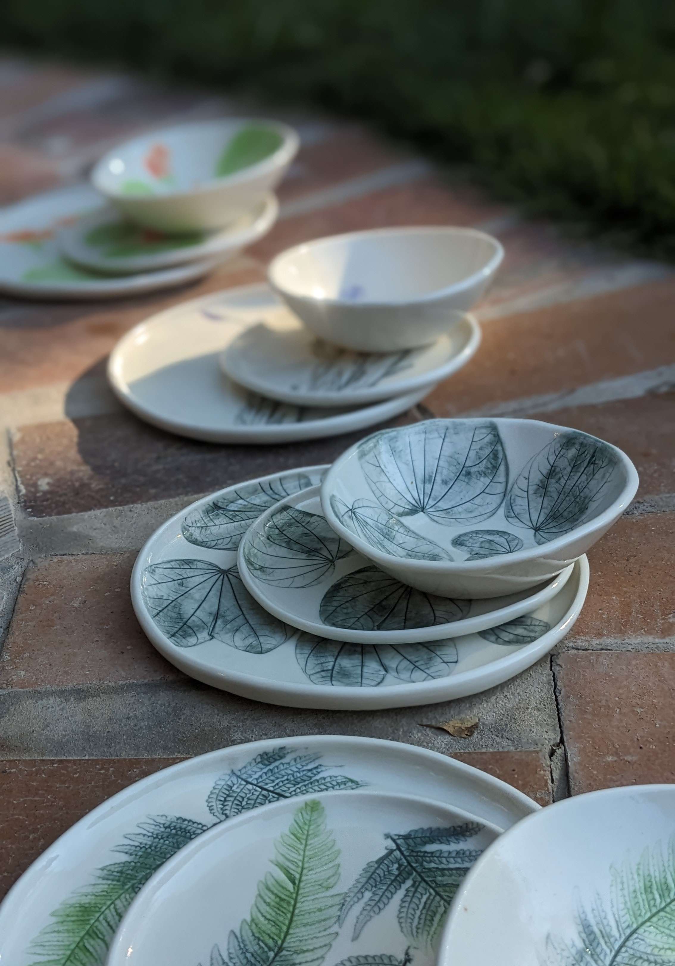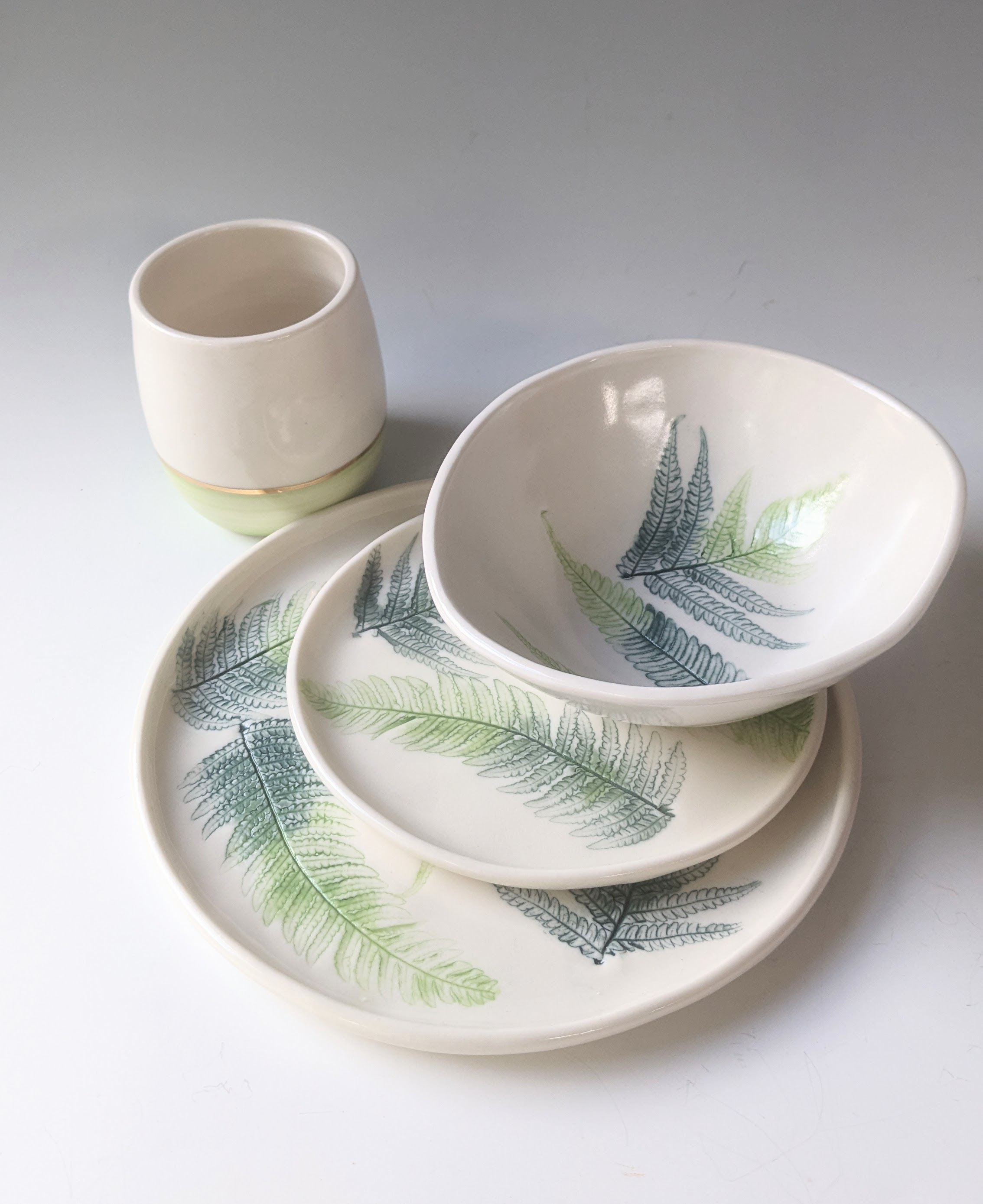 The botanical sets are made from porcelain and hand painted with underglaze colours. They are hand pressed with flora from my garden. The set consists of a plate, bowl, side plate and beaker. The beaker has a gold lustre line highlight.