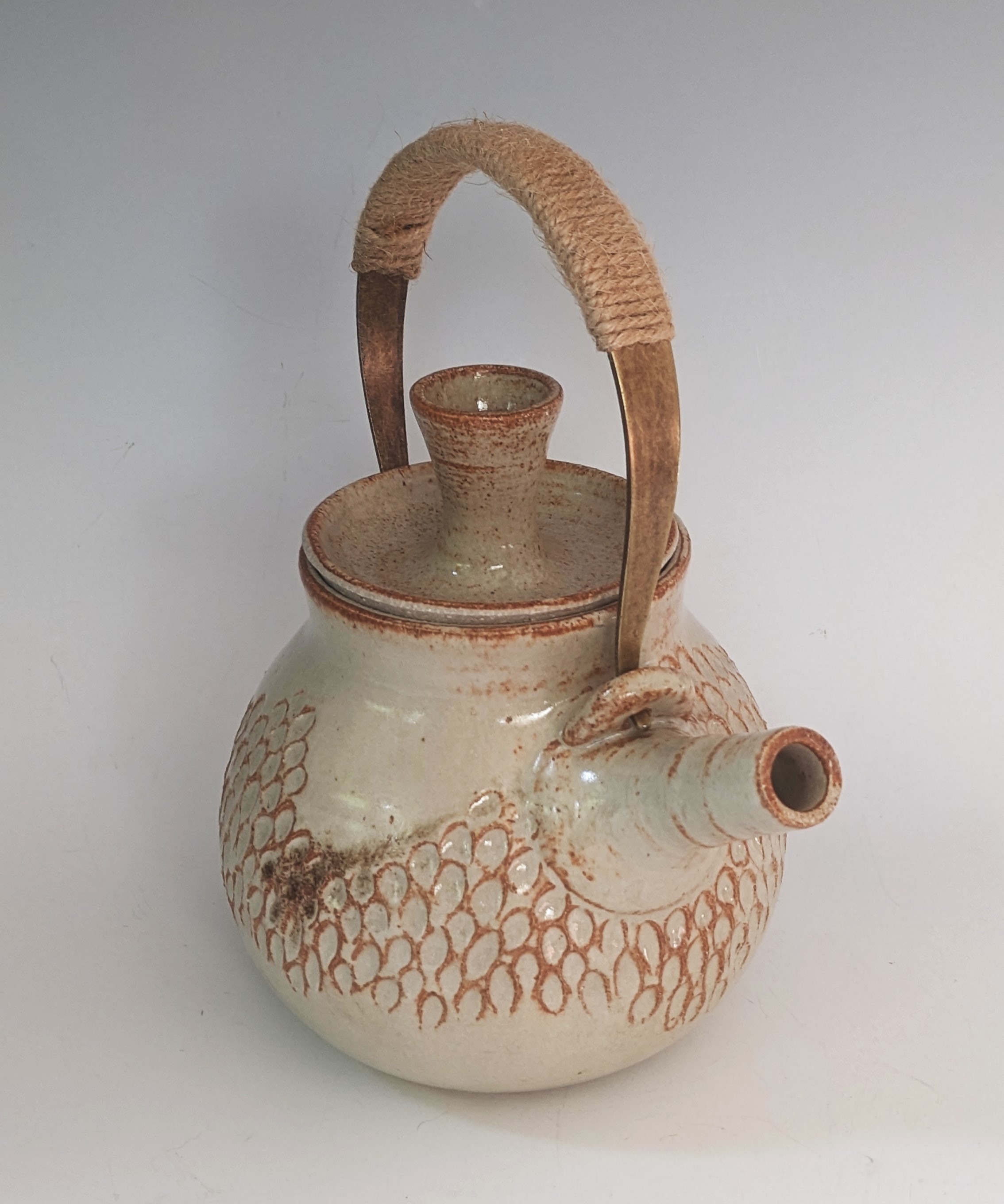 Facetted handmade creamy teapot, hand functional teapot with two cup capacity. Jute wrapped brass handle for ease of use. Gorgeous cream glaze that breaks a warm toasty colour on edges.