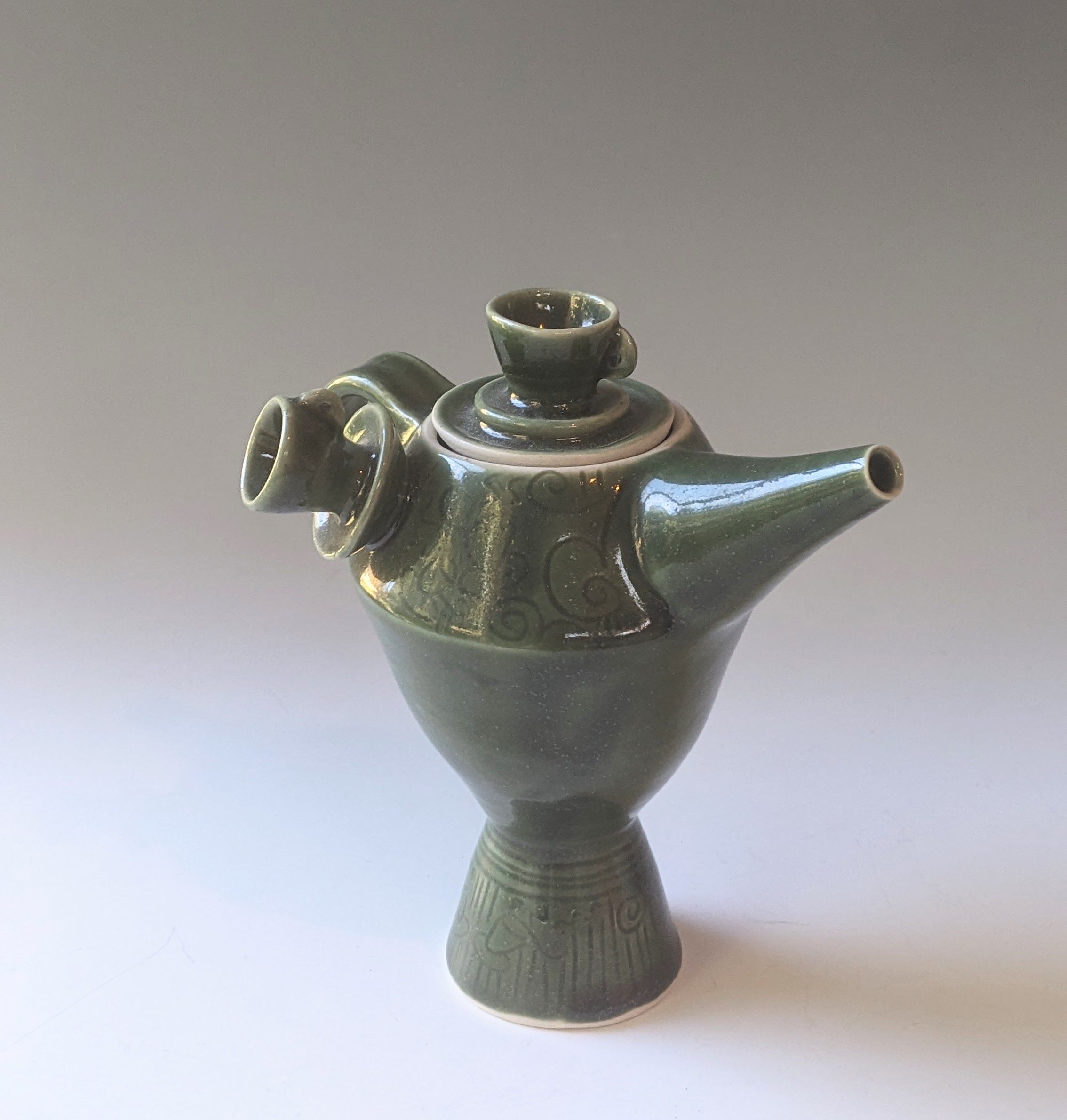 Nicci at PJ Pottery is a full-time professional ceramicist. She creates stylish ceramic homeware such as this green teapot with teacup lid from her pottery studio. She divides her time between teaching small private classes and producing ware. You can visit during her open studio events once or twice a year. There is an onsite gallery that is open by appointment so you are welcome to email to book a time at hello@pjpottery.com