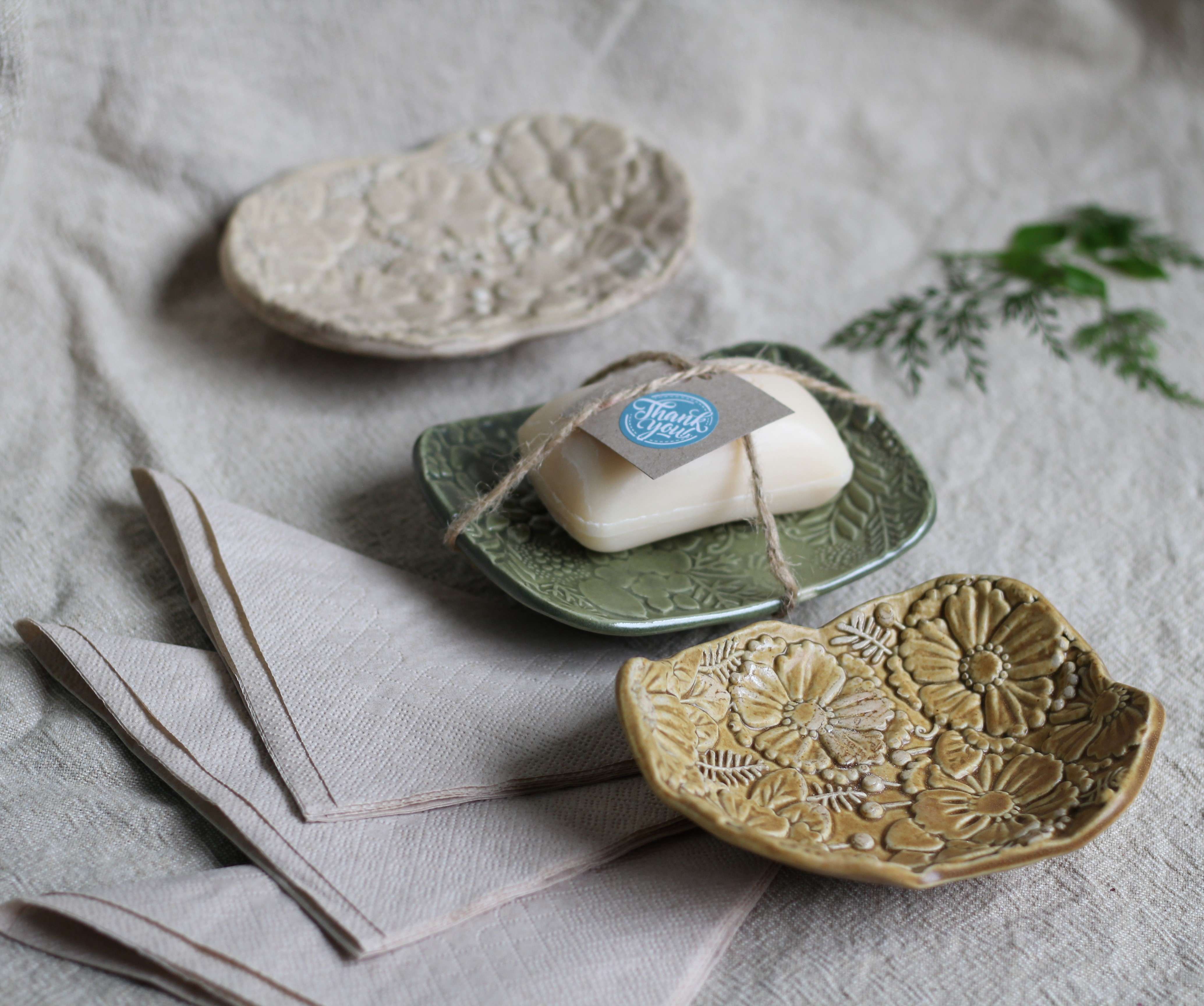These soap or trinket dishes are lovingly handmade and beautifully textured. They have little feet to allow them to drain and can be ordered with holes put in the base.