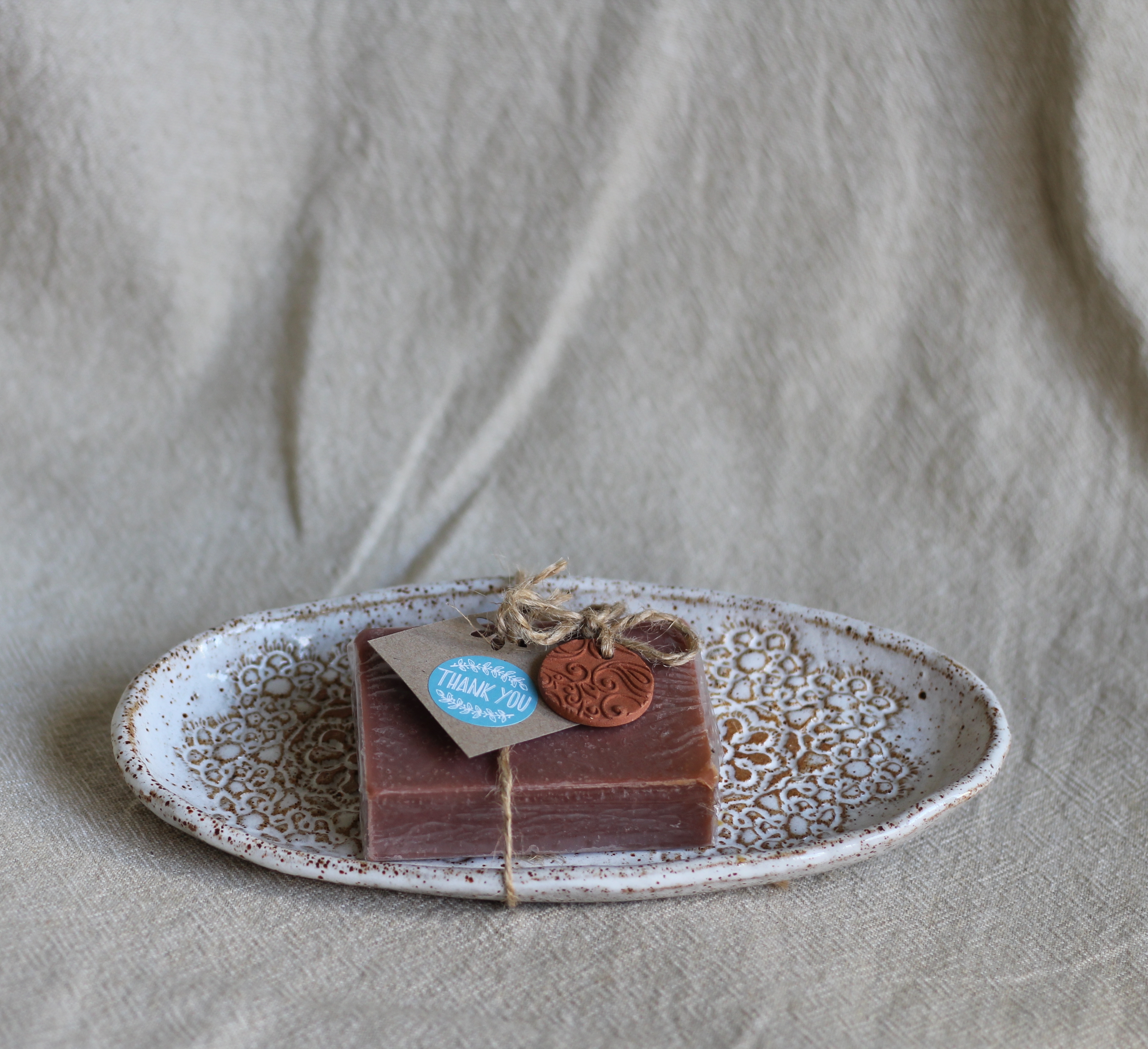 These soap or trinket dishes are lovingly handmade and beautifully textured. They have little feet to allow them to drain and can be ordered with holes put in the base.