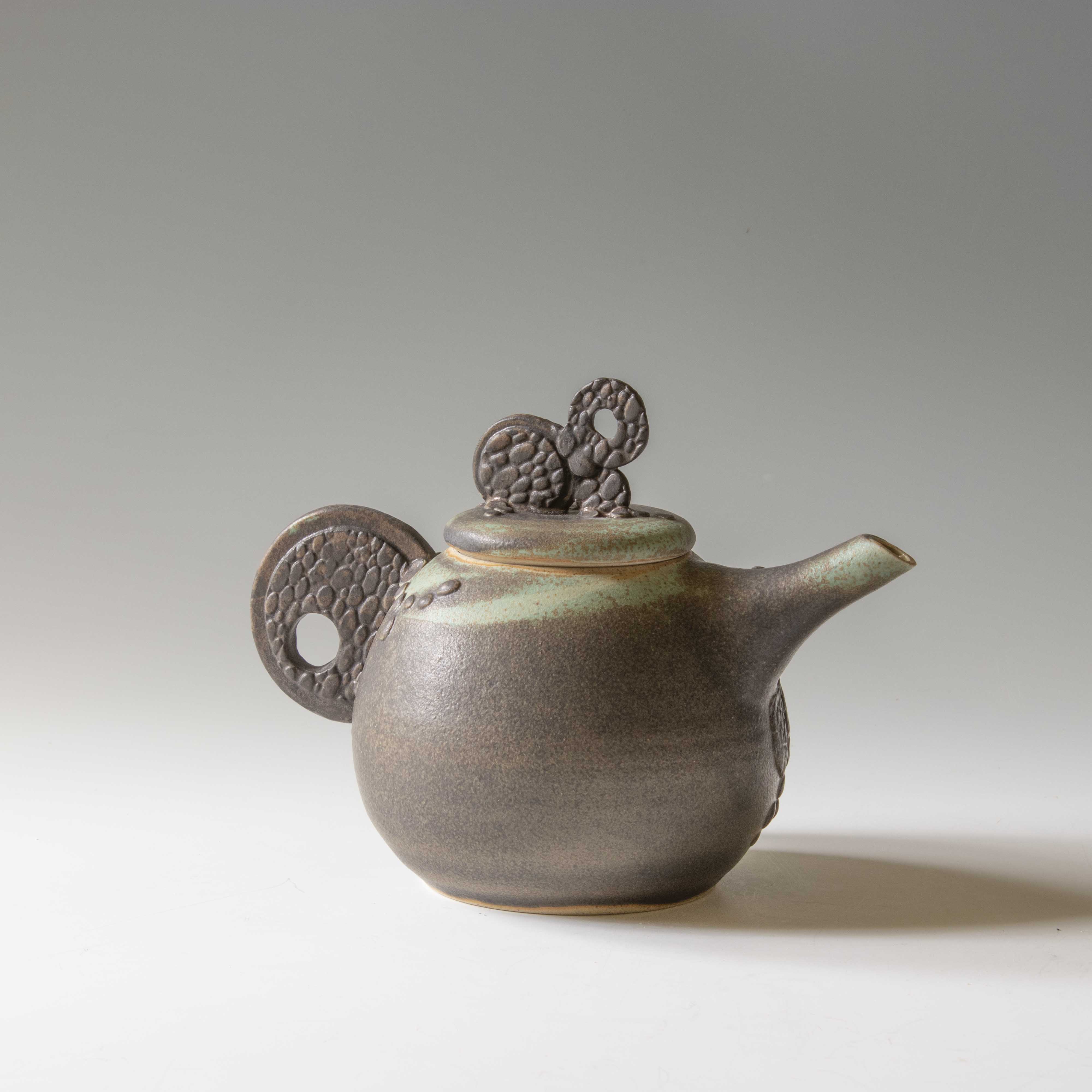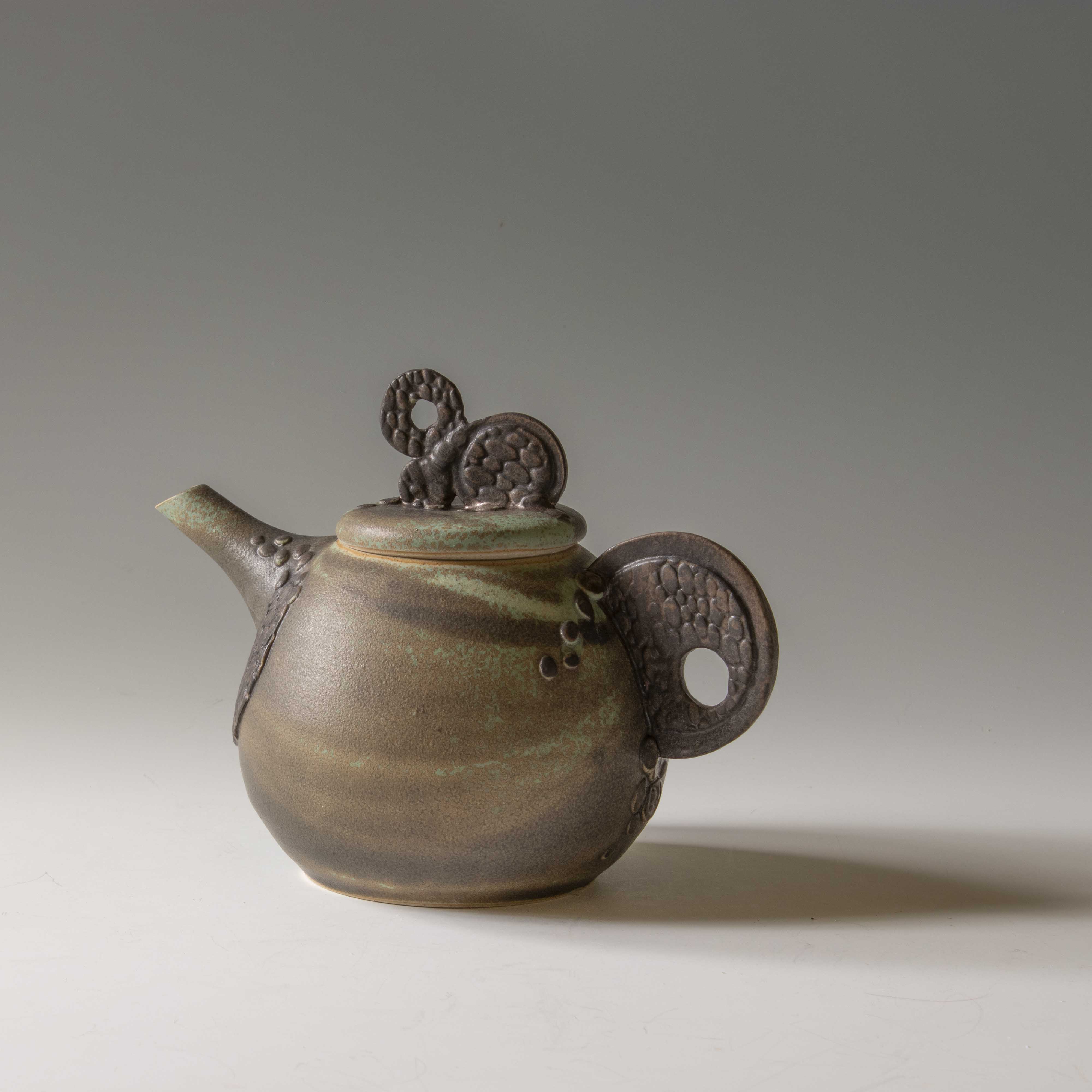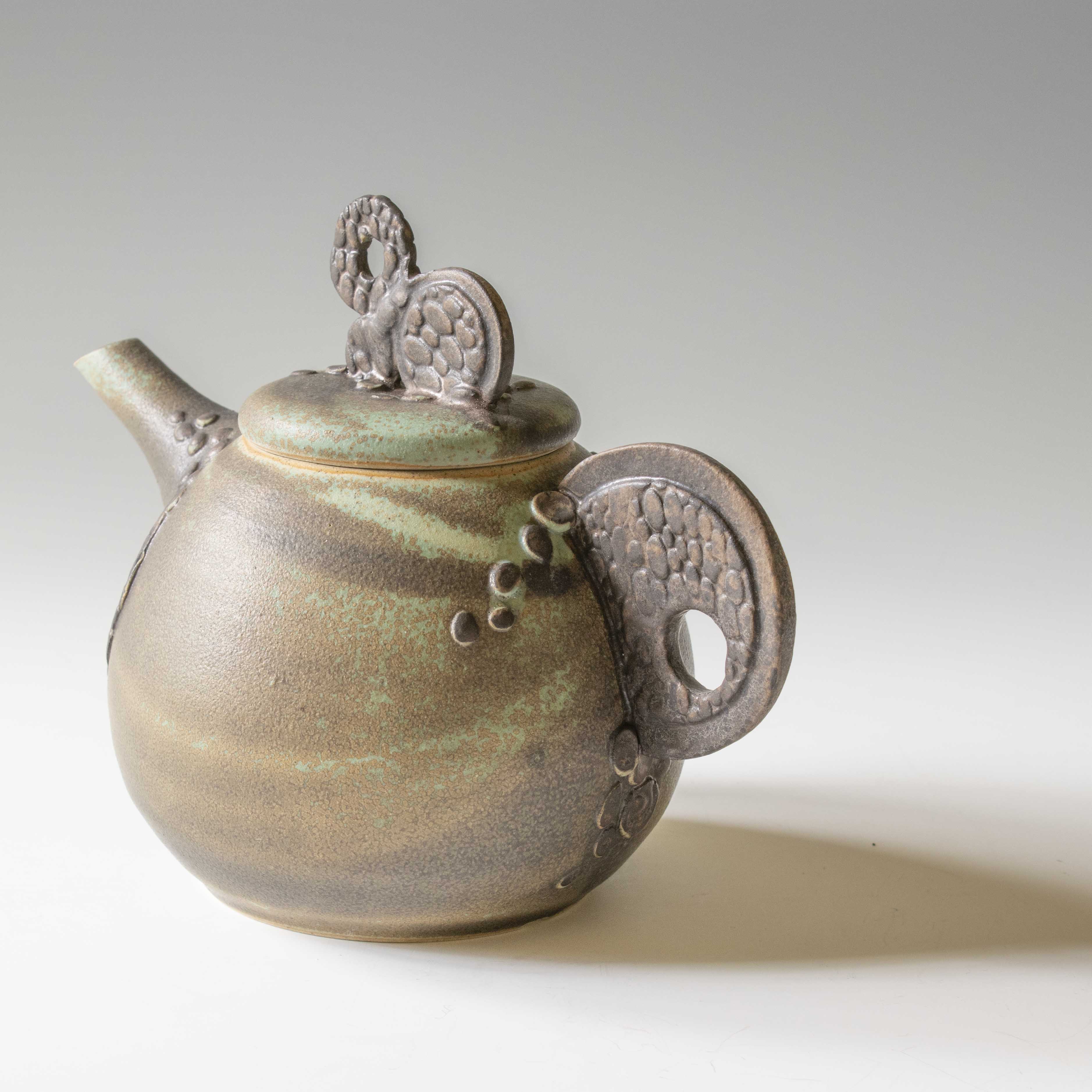This lovely round teapot has soft muted earthy tones and pebble pattern on the body and handles, added by hand. This is a functional pot, midfired and glazed in a satin matt copper glaze and gloss glaze interior. 2-3 cup capacity.