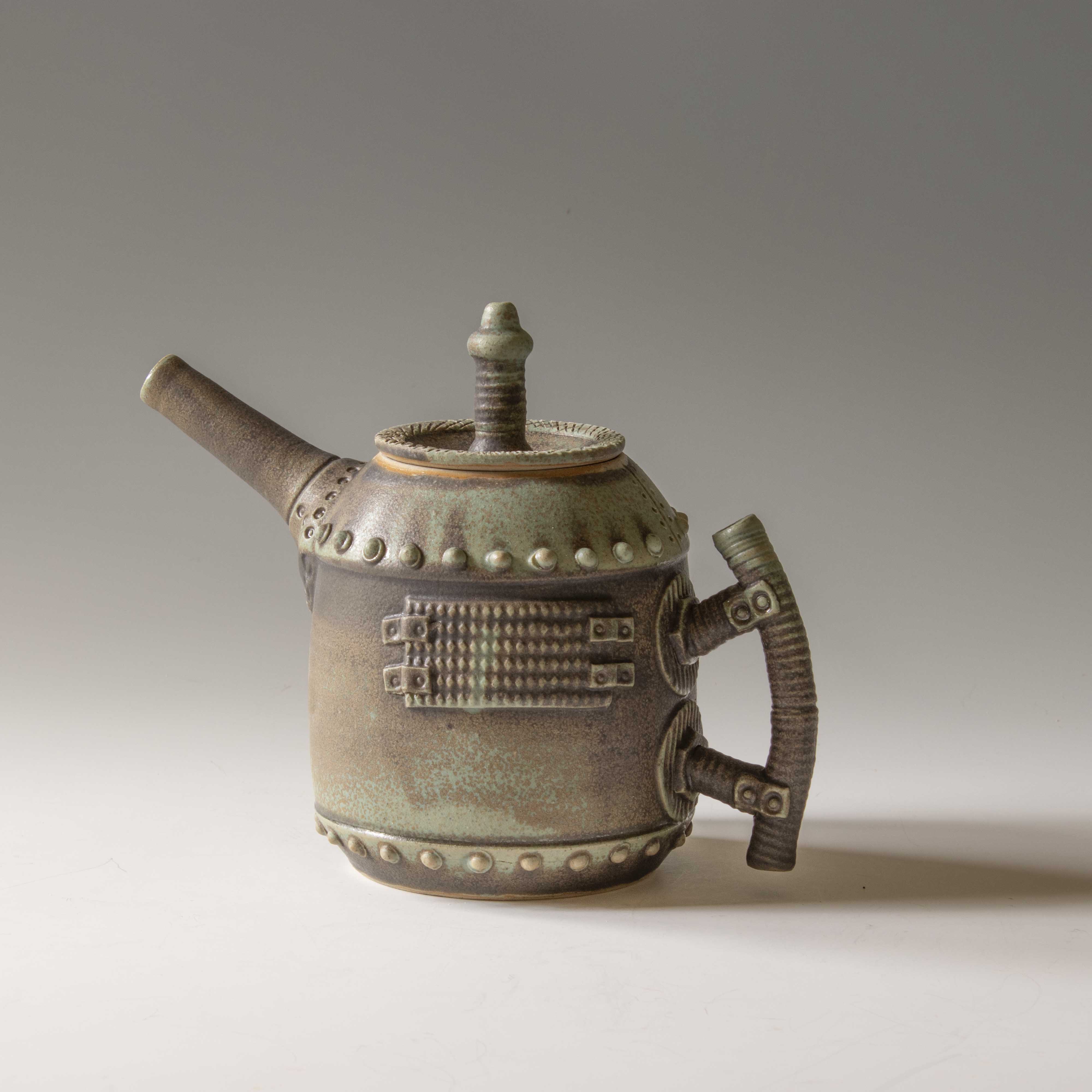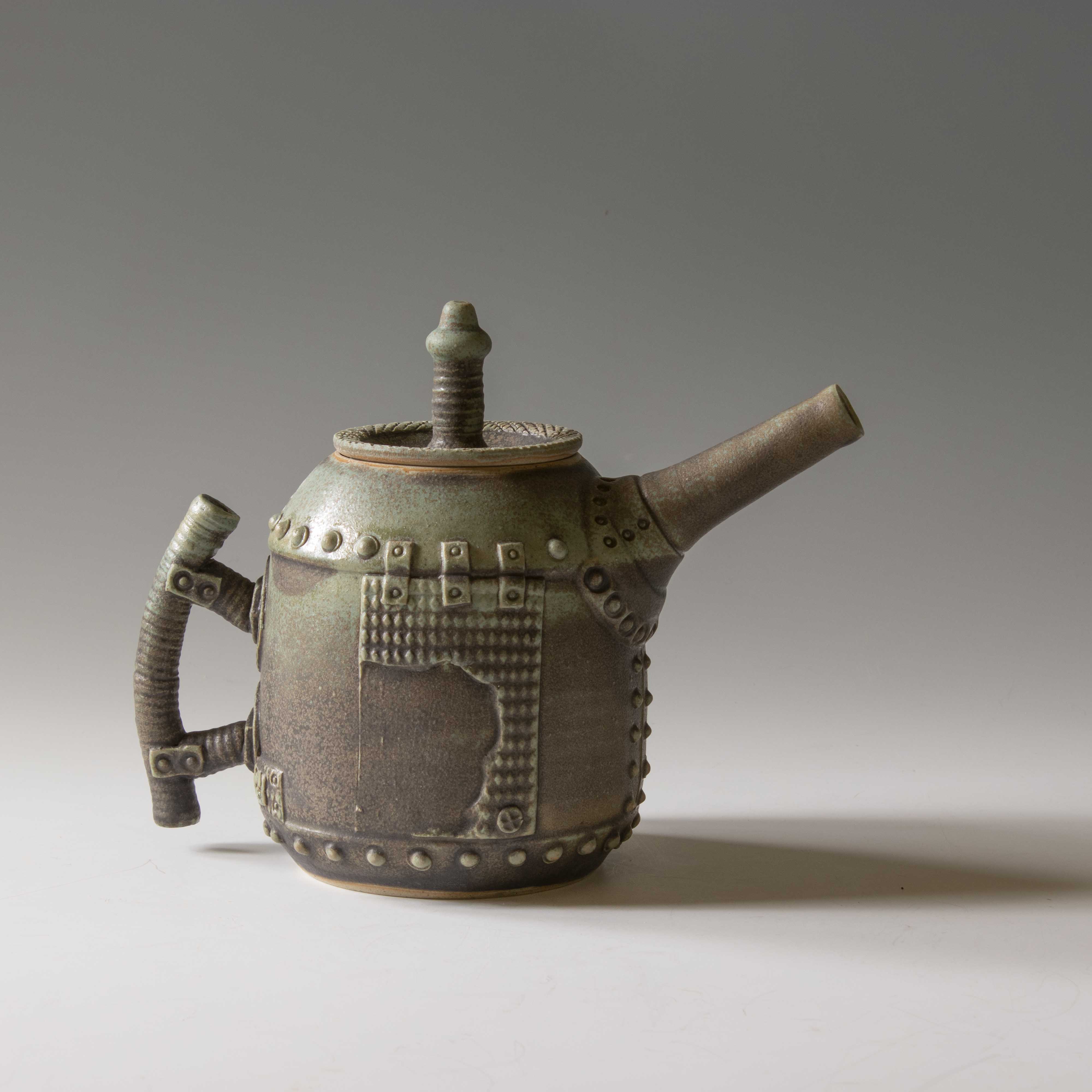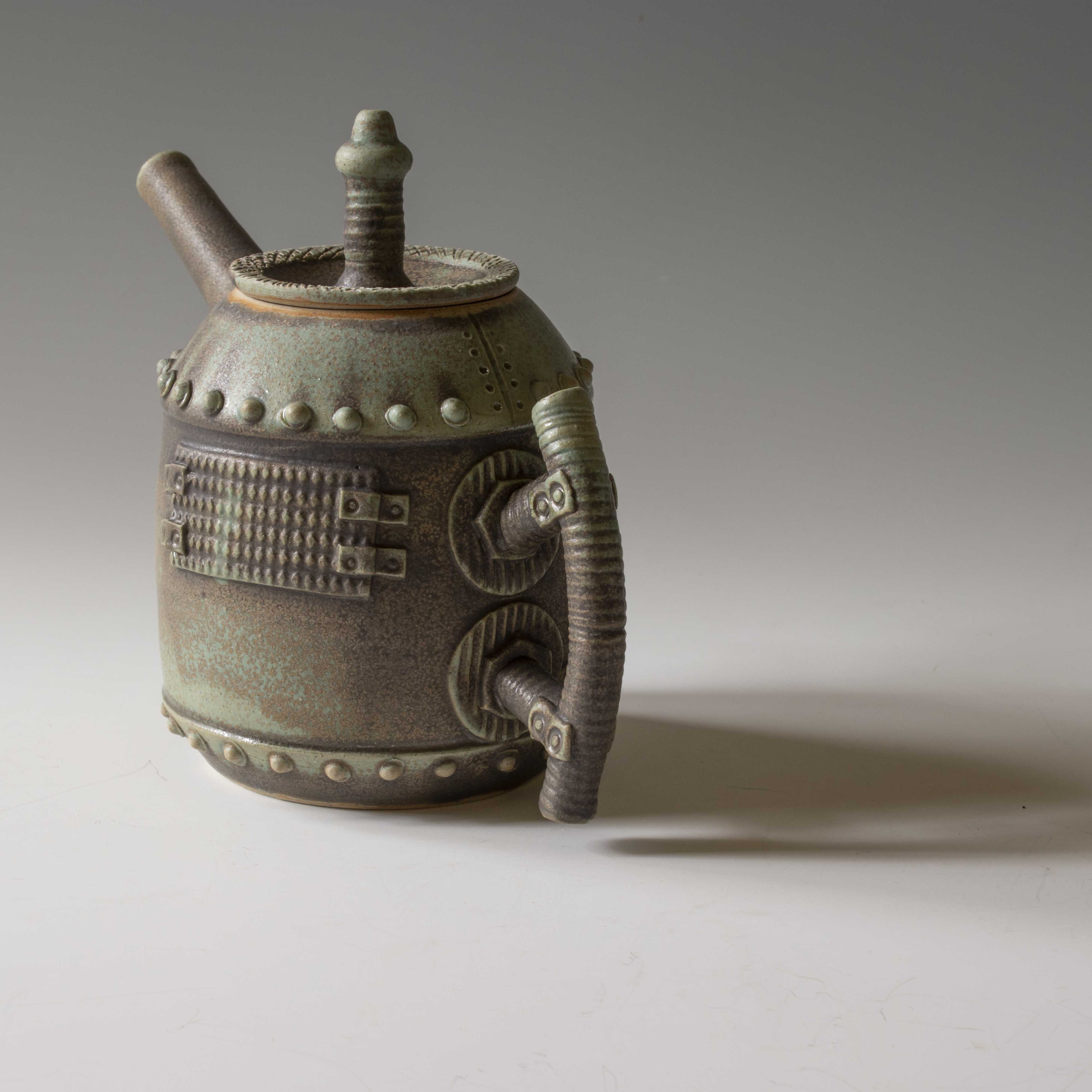 Steampunk style teapot with “threaded” handles, industrial look “joinings” and hand decorated mesh pattern. This is a functional pot, midfired and glazed in a satin matt copper glaze and gloss glaze interior. 2-3 cup capacity.