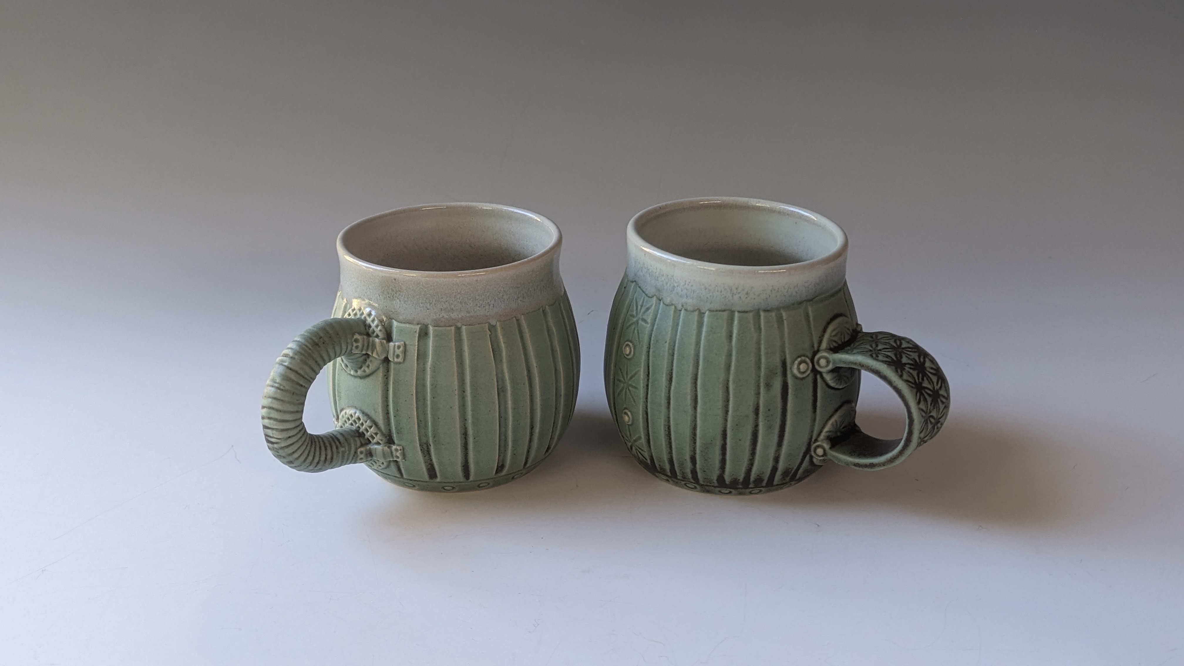 Unusual, useful and delightful. How about a Steampunk mug? Hand decorated and textured. Once you have drunk from a hand crafted ceramic mug, you will not want to drink from a cheap factory-made cup again! Limited stock available. High fired and glazed in a satin copper green glaze and creamy interior.