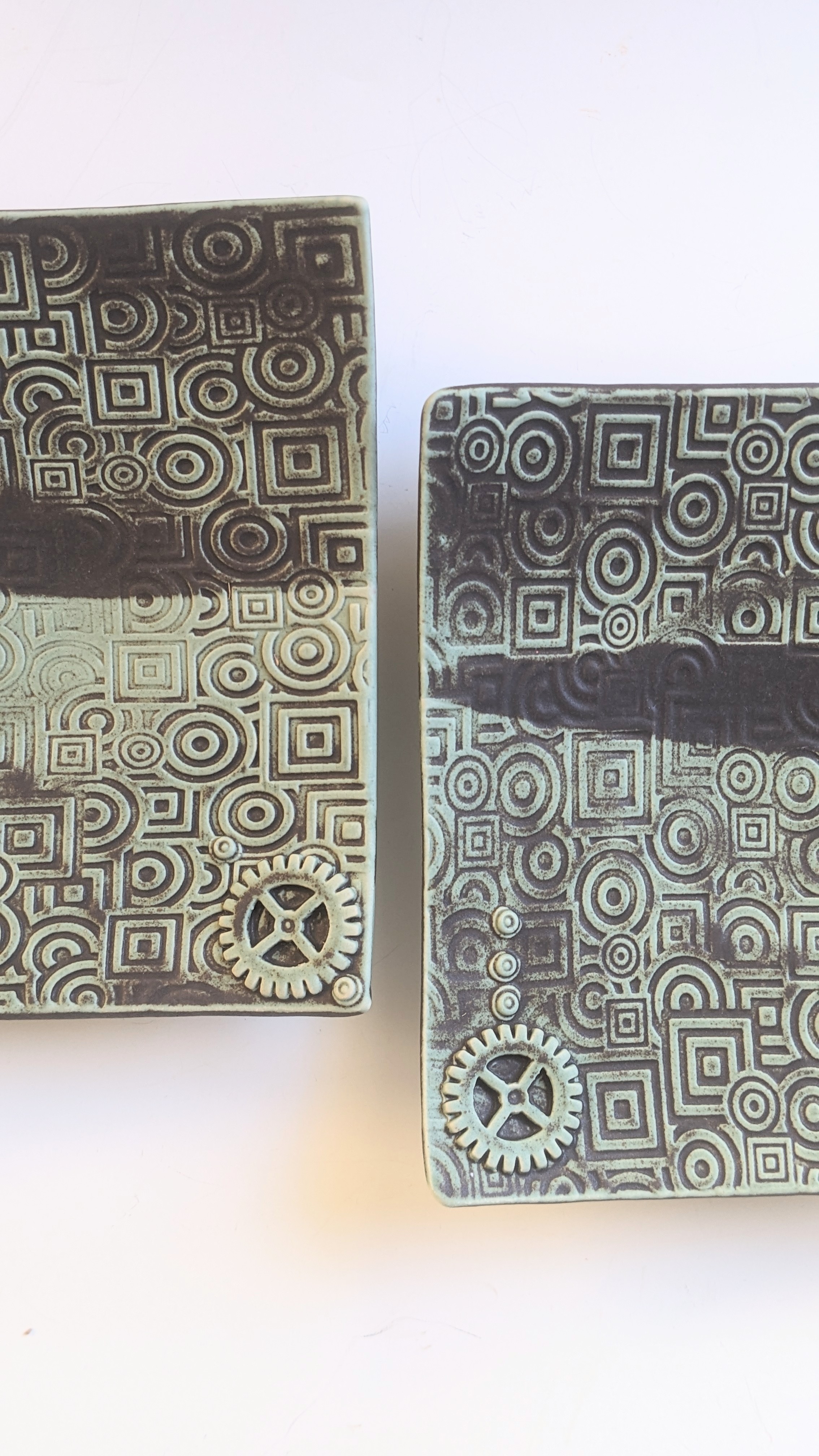 Unusual, useful and delightful! Steampunk plate with hand decorated textured. High fired and glazed in a satin matt copper glaze. $45 each, contact us for custom orders