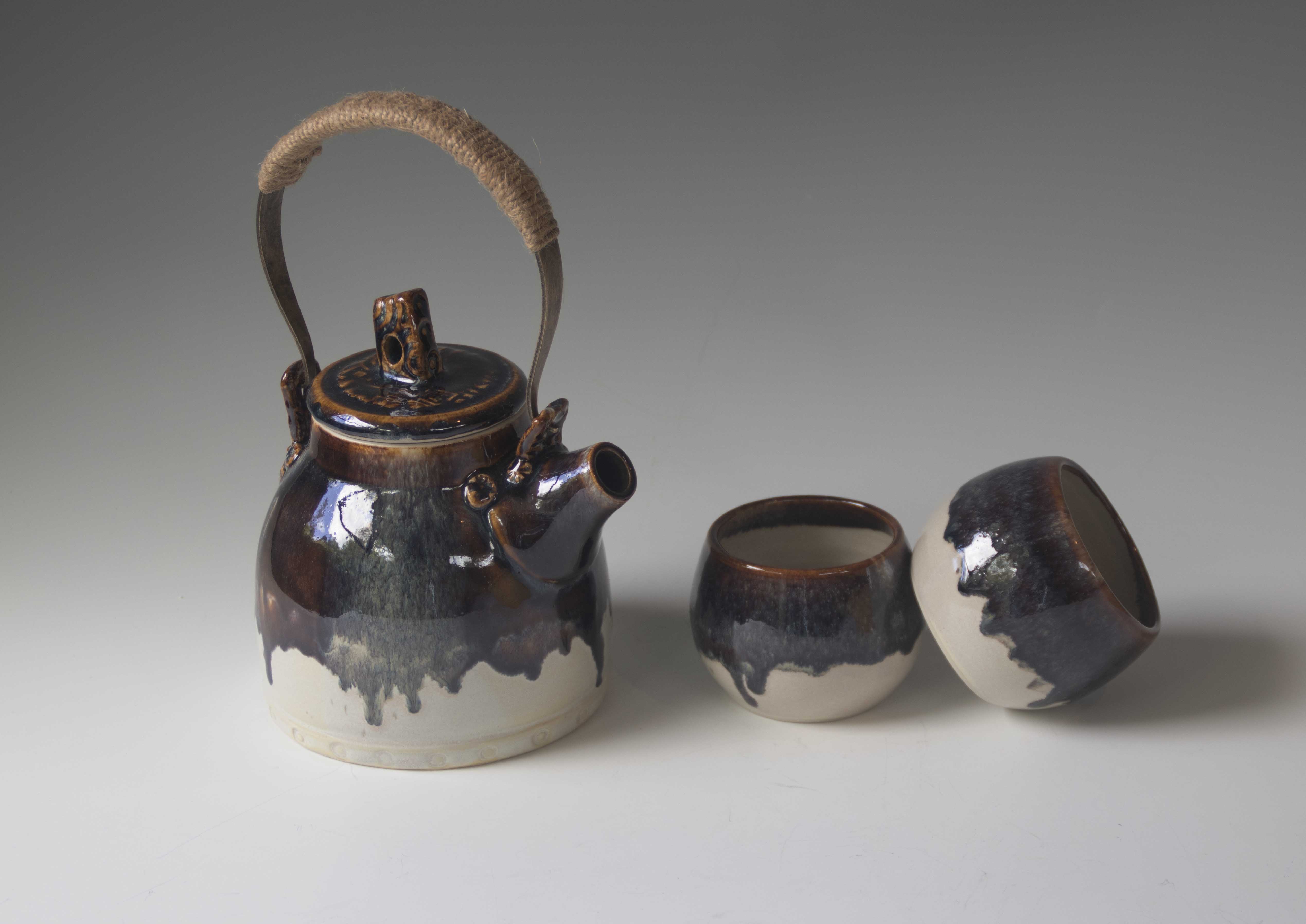 This Temoku teapot with metal handle and two cups has jute-bound metal handle for comfortable handling and pouring. High fired  in a Japanese style Temoku glaze which is an iron-rich glossy chocolate colour with a creamy Chun glaze interior. It is fully functional with a 2-3 cup capacity. This delightful little tea set is comprised of teapot and two matching cups and would make a beautiful gift for a tea lover.
