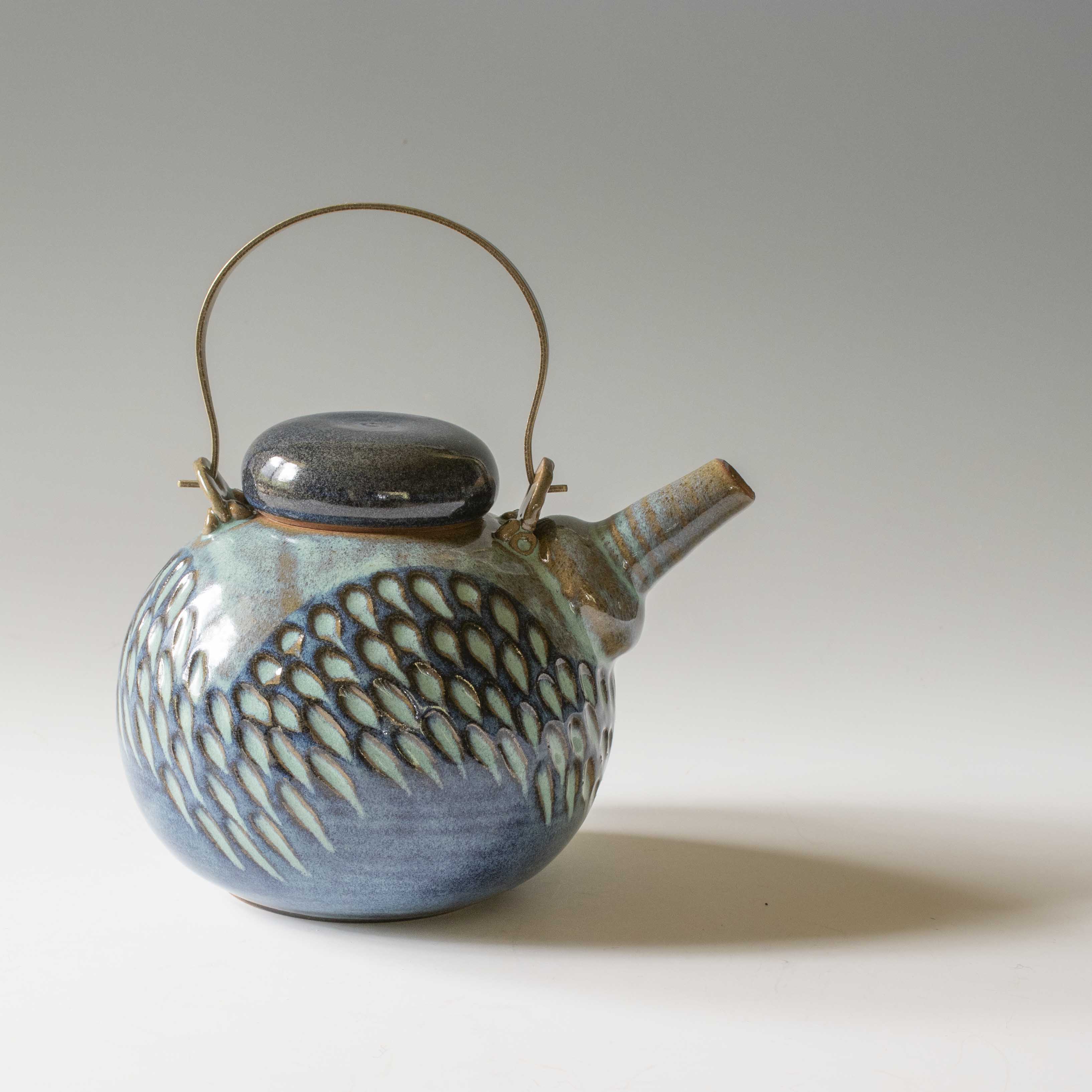 This lovely round teapot has been hand carved (faceted) and glazed with a gorgeous frosted turquoise glaze. It has a brass handle and is a fully functional 2-3 cup teapot.