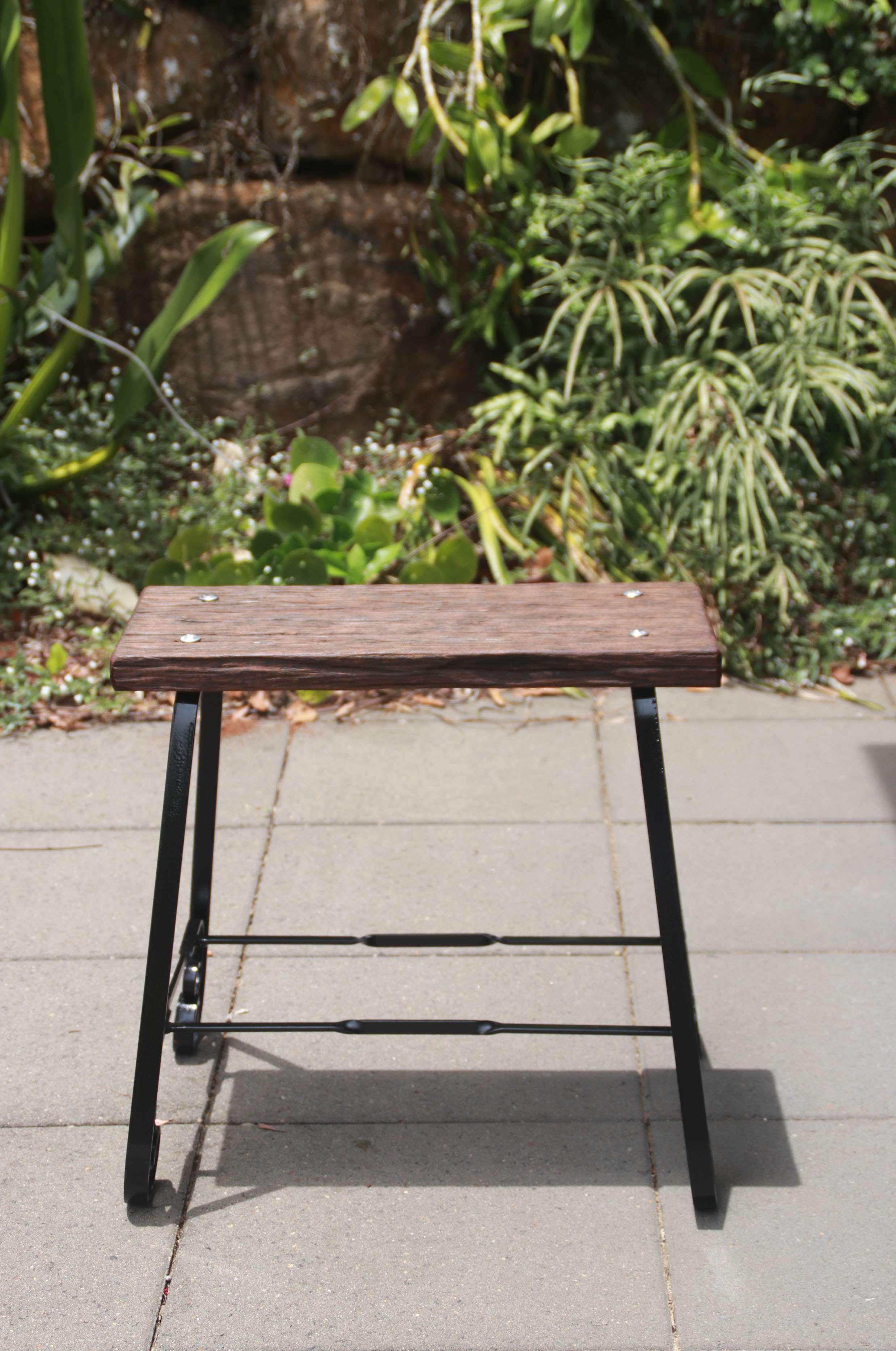 This stylish sturdy bench  is handmade wrought iron with a repurposed timber top. Top 240mm depth x  520mm length x 470mm height. This unique piece is suitable for outdoor areas as a seat, a planter stand or whatever takes your fancy.
